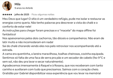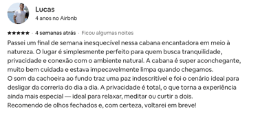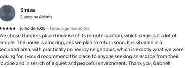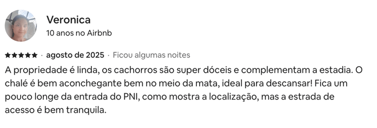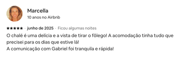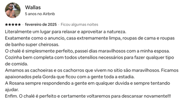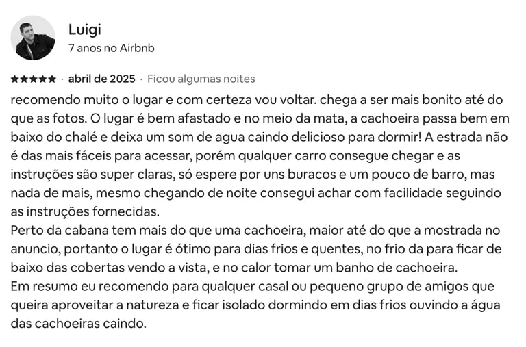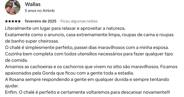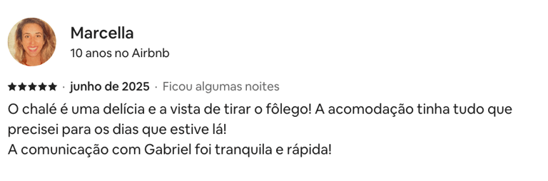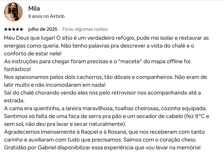 Estadia perfeita, fácil acesso, muita privacidade! O chalé é tudo que foi dito no anúncio e muito mais. Dormimos e acordamos com o barulho do rio, banho quentinho, muitos cobertores! O Gabriel foi super solícito e nos atendeu sempre que precisamos.