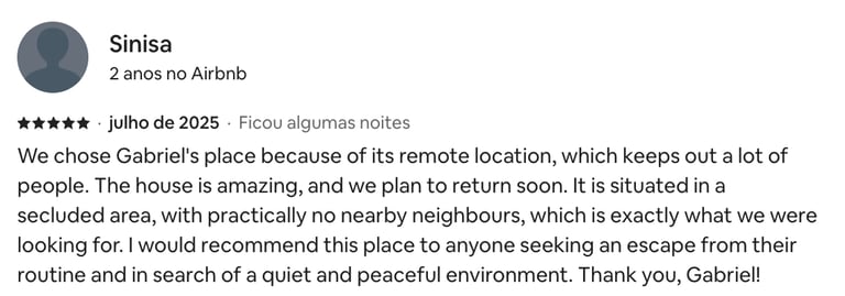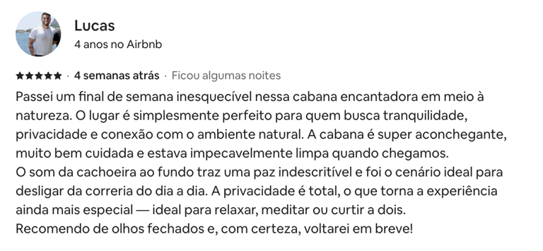 Minha estadia neste Airbnb superou todas as expectativas! Situado no coração de uma paisagem natural deslumbrante, o local oferece uma experiência de tranquilidade e privacidade incomparáveis. Desde o momento da reserva, o host demonstrou uma comunicação exemplar, respondendo rapidamente a todas as dúvidas e fornecendo detalhes valiosos para garantir uma chegada sem complicações.